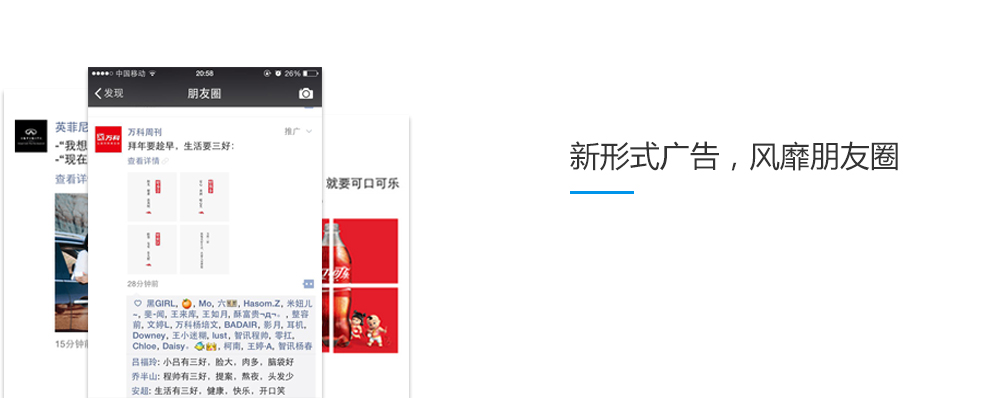 朋友圈廣告將會通過微信廣告系統進行投放和管理,廣告本身內容將基于微信公眾賬號生態體系, 以類似朋友的原創內容形式進行展現,在基于微信用戶畫像進行定向的同時,依托關系鏈進行互動傳播。