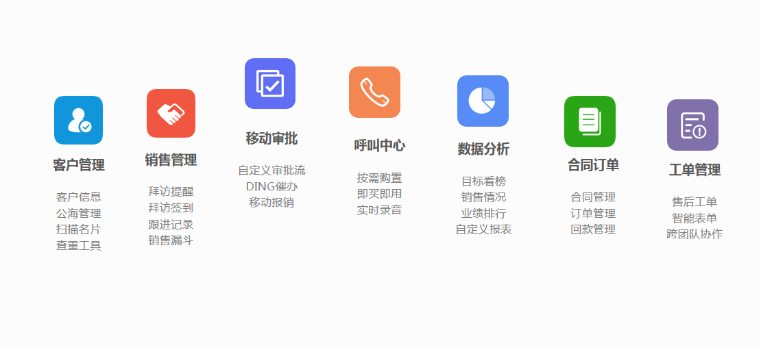 CRM是一款SaaS模式的客戶關系管理軟件,基于釘釘平臺進行研發,以客戶管理為核心,包含客戶管理、銷售全流程管理,合同訂單、項目管理、工單管理、呼叫中心、移動審批、數據分析八大模塊。旨在助力企業銷售全流程精細化、數字化管理,全面解決了企業銷售團隊的全流程客戶服務難題,幫助企業有效盤活客戶資源、量化銷售行為,合理配置資源、建立科學銷售體系,提升銷售業績
