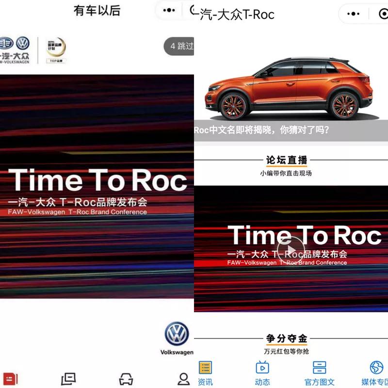 以一汽-大眾和有車以后合作的開屏廣告小程序來看,里面涵蓋了新車T-Roc探歌的車型報道信息,新車上市直播,答題小游戲以及發布會媒體的現場簽到功能,可以說,一汽-大眾把一場新車發布會裝進了一個小程序里面。