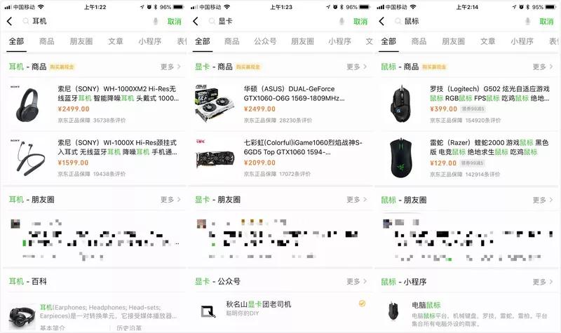 但如果搜索關鍵詞是「1080ti顯卡」,系統便認為用戶是在搜索一個商品而非內容,會呈現「1080ti顯卡」這個小類目下的各品牌商品,與前述大類目搜索類似。