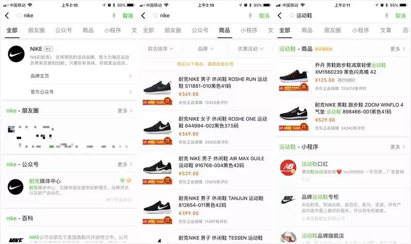 但是,搜品牌名并不會在默認首頁即「全部」一欄里出現商品信息,而「商品」一欄也被排在「朋友圈」和「公眾號」之后,排在「小程序」和「文章」等欄目之前。