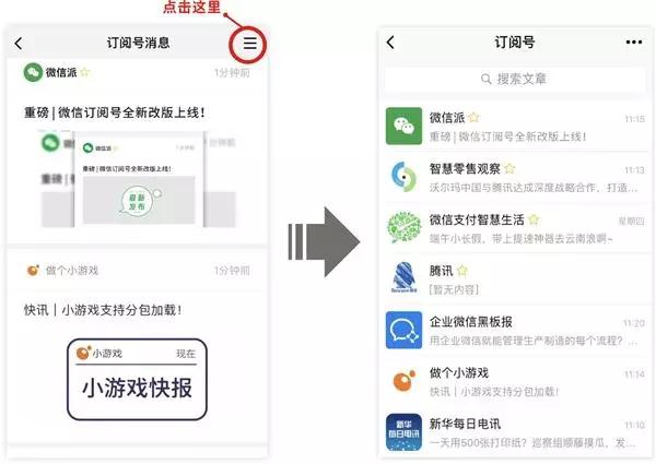 2、訂閱號消息入口變淺,用戶點擊即可立即閱讀詳細內容,而不必再點擊一次進入訂閱號主頁,獲取關注和取消關注也更容易。