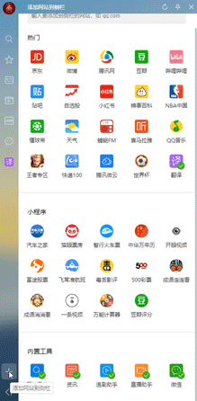 早在7月3日,QQ瀏覽器10.2 Beta 版本中,就已經支持了網頁端打開小程序,用戶只需點擊瀏覽器左側底部工具欄中的「+」號,即可打開小程序列表頁面,網頁端的小程序頁面與手機打開的小程序頁面完全一致。